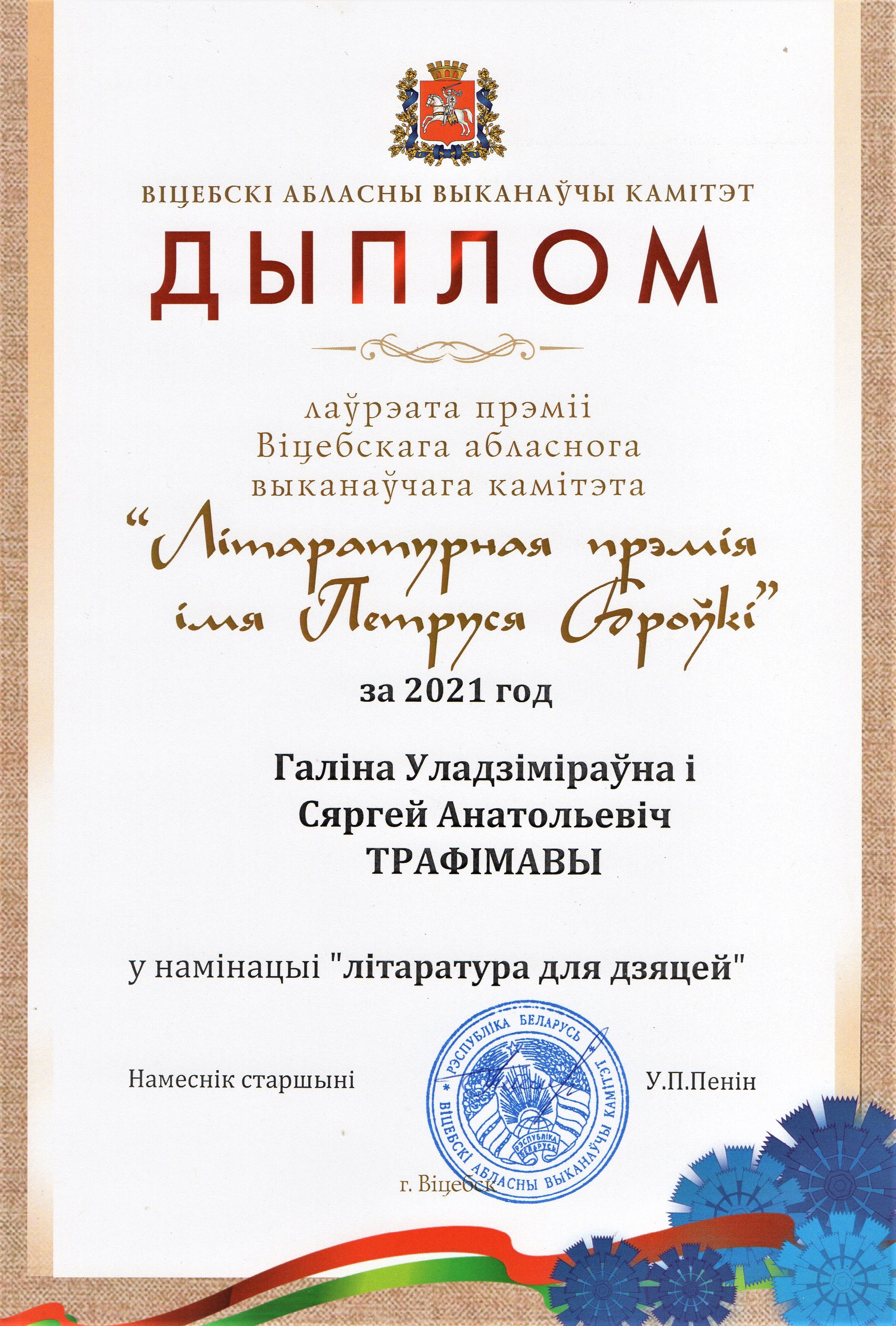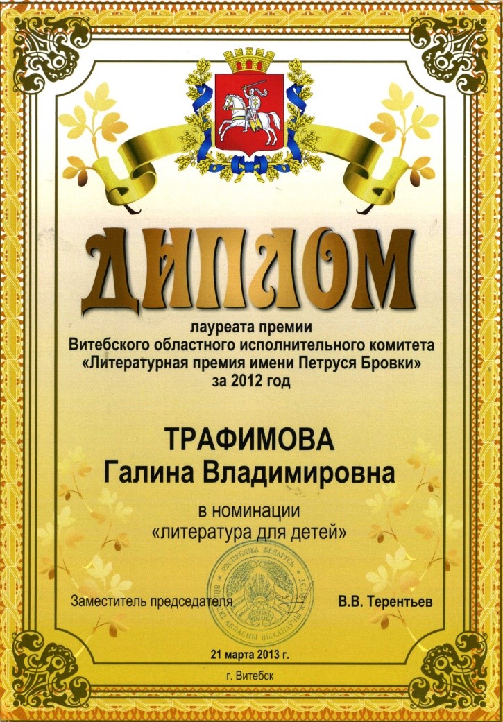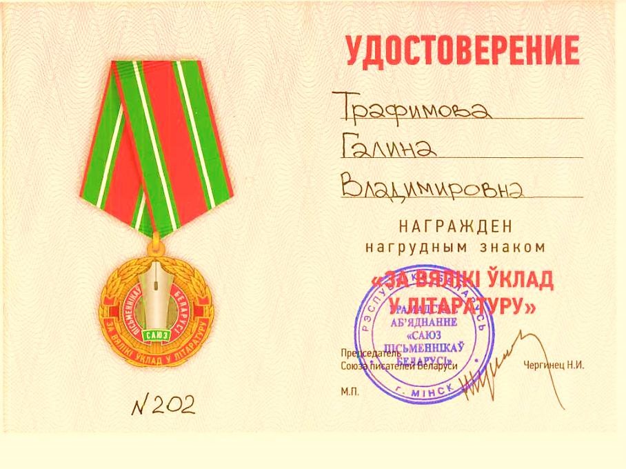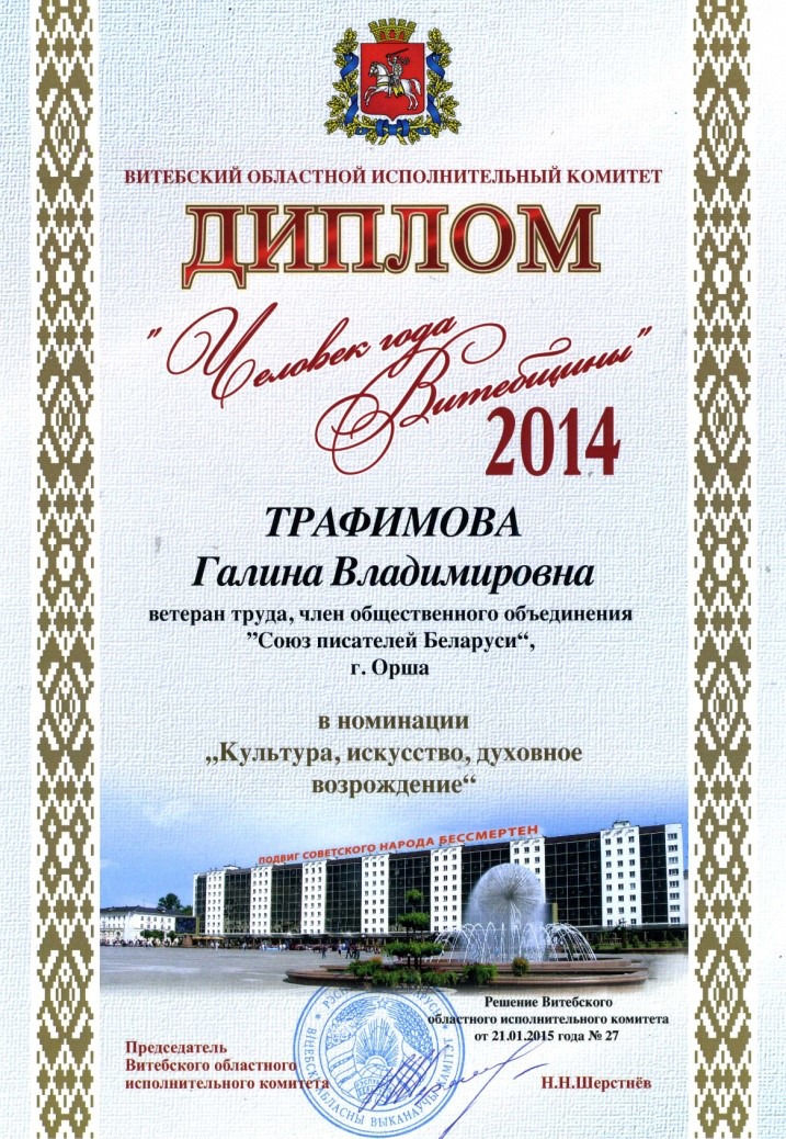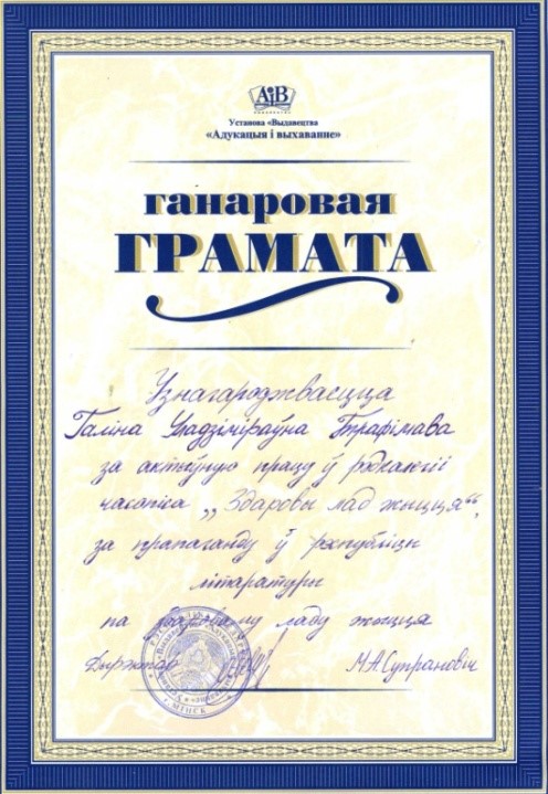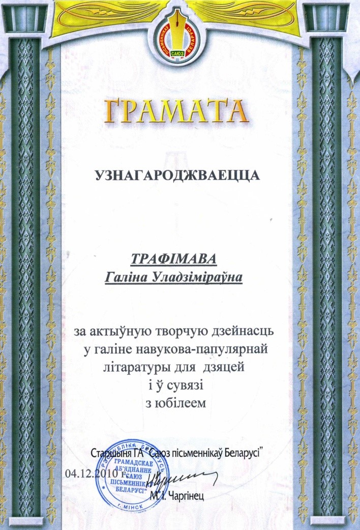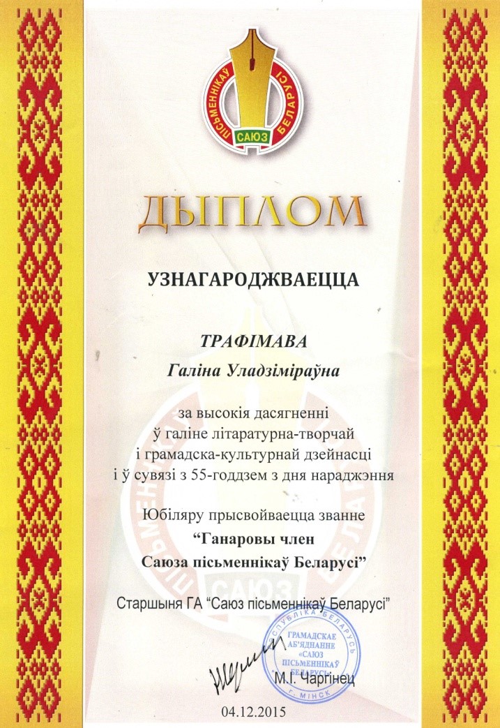 Раздзел уключае ганаровыя граматы, дыпломы, падзякі, якімі ўзнагароджанны Галіна і Сяргей Трафімавы