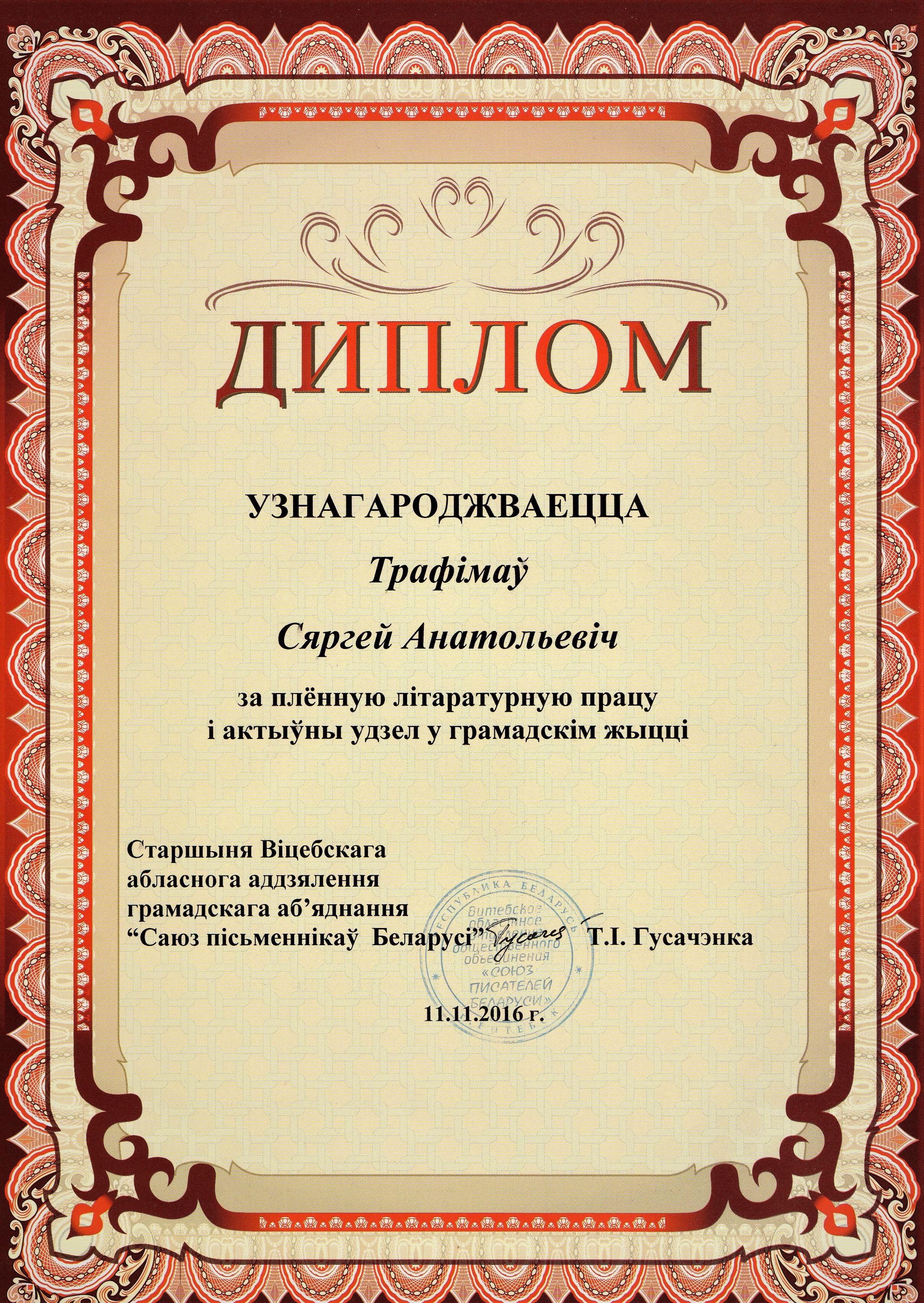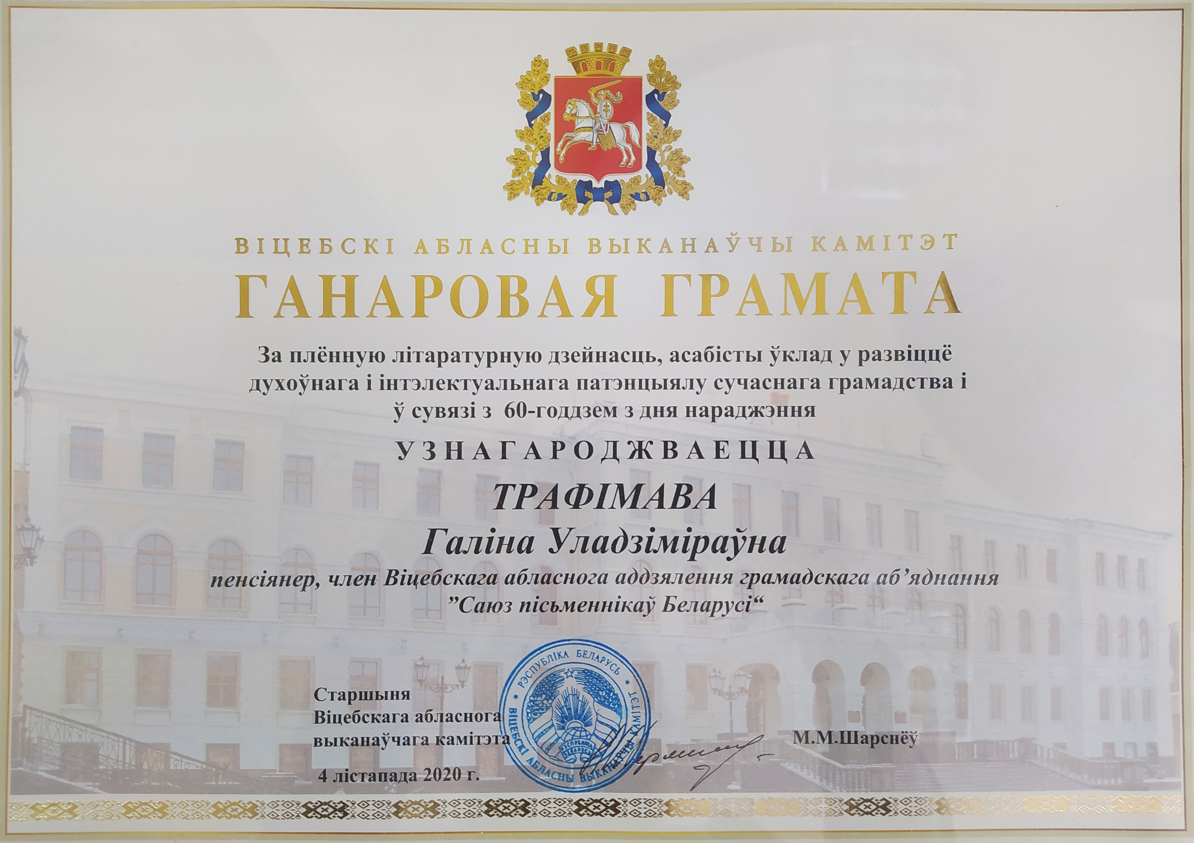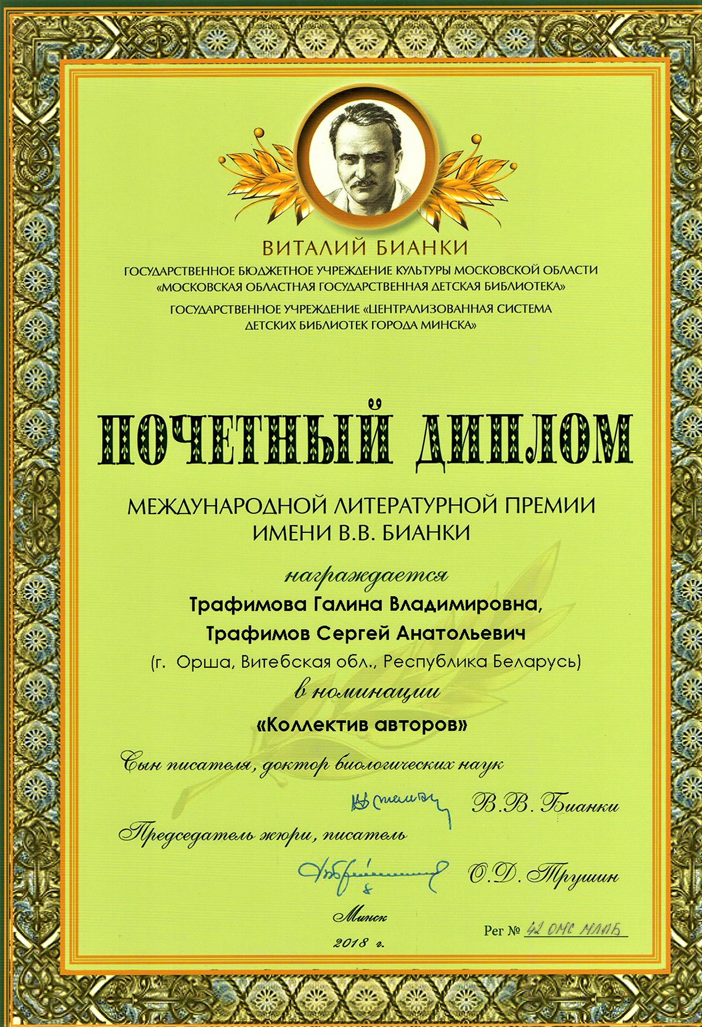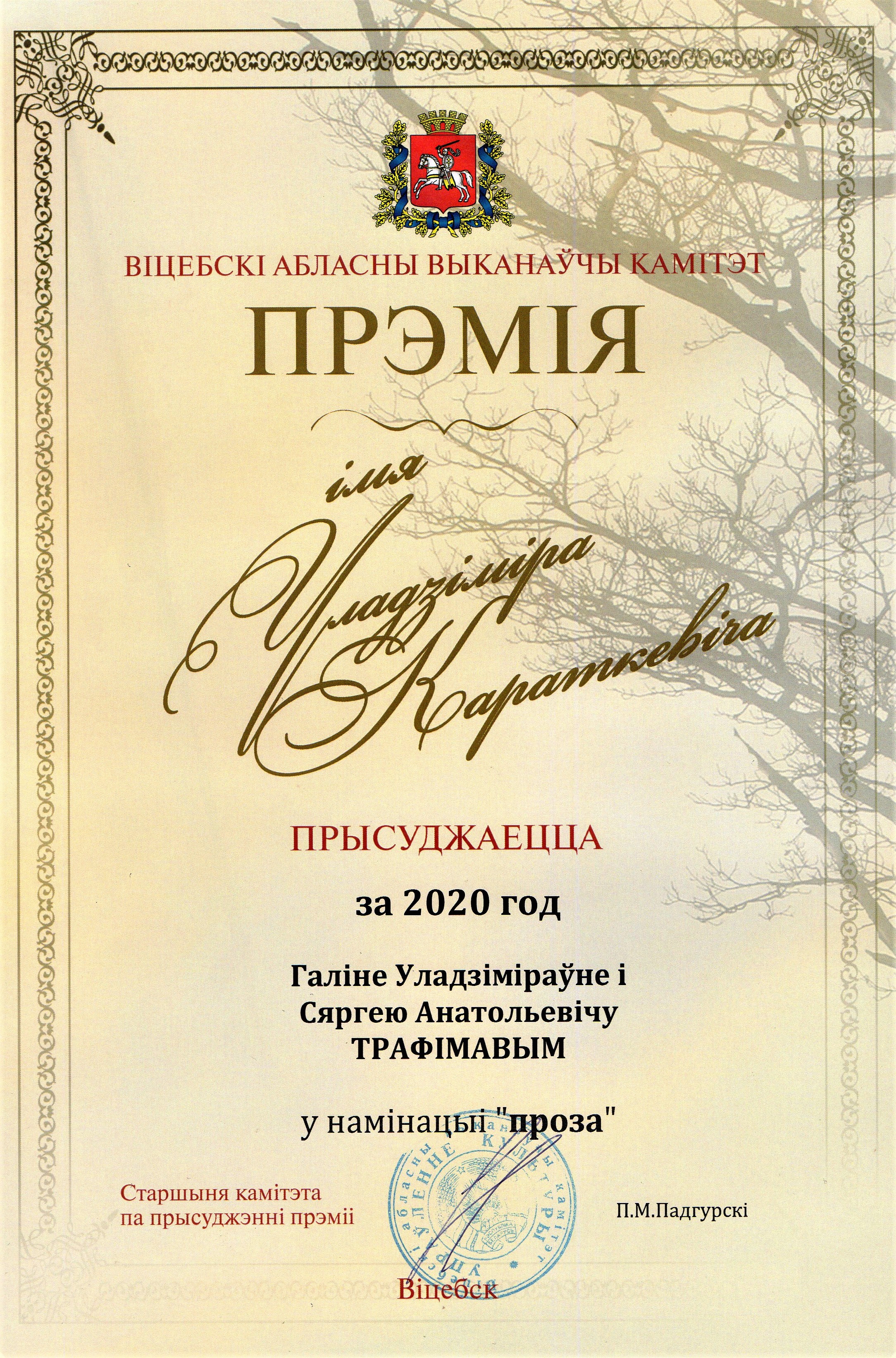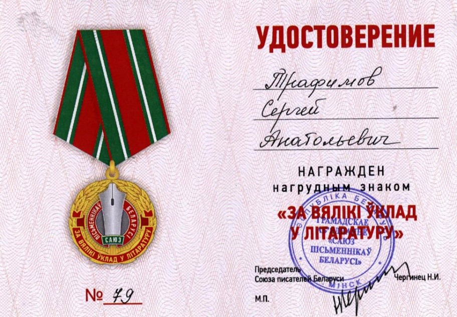 Раздзел уключае ганаровыя граматы, дыпломы, падзякі, якімі ўзнагароджанны Галіна і Сяргей Трафімавы