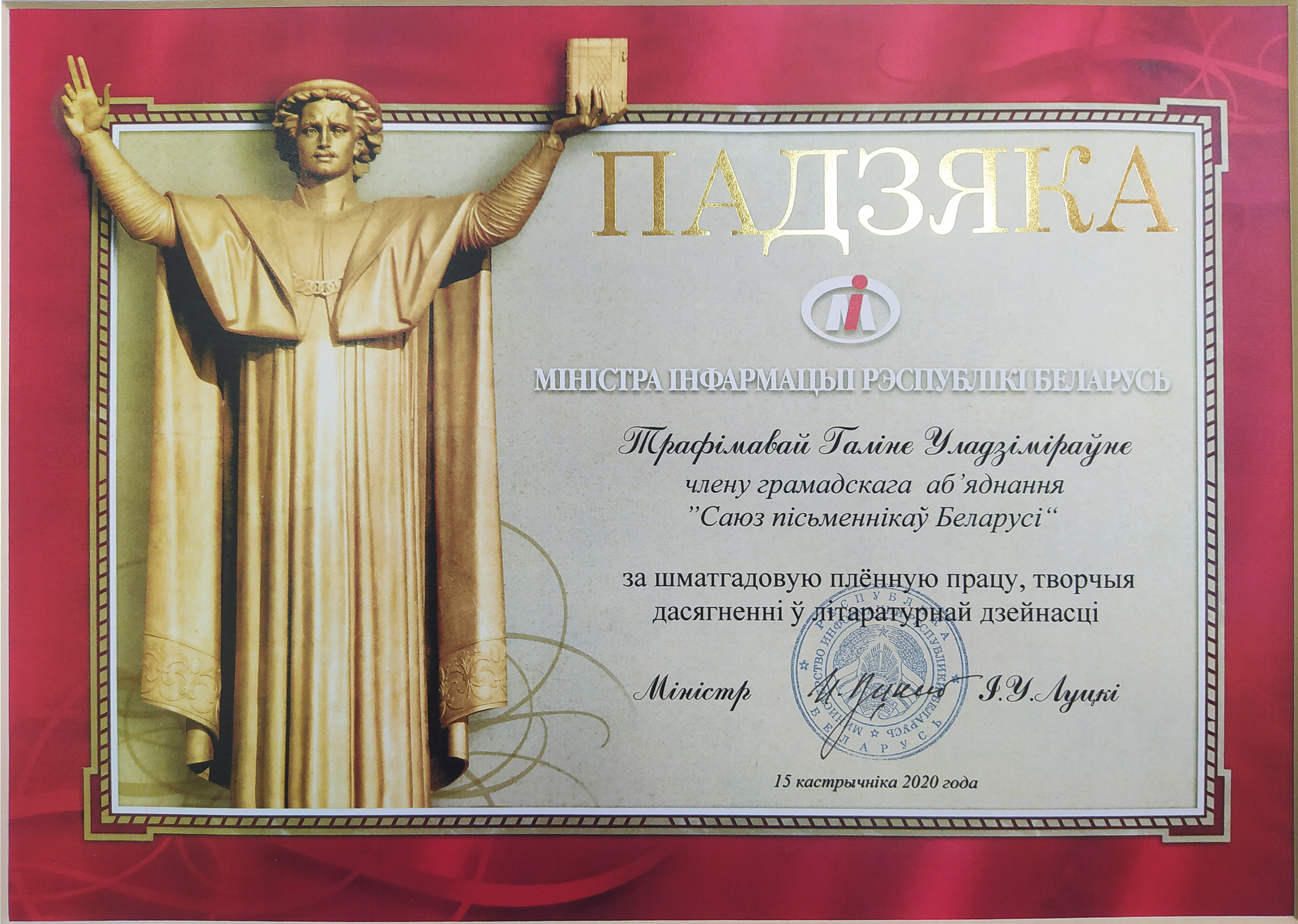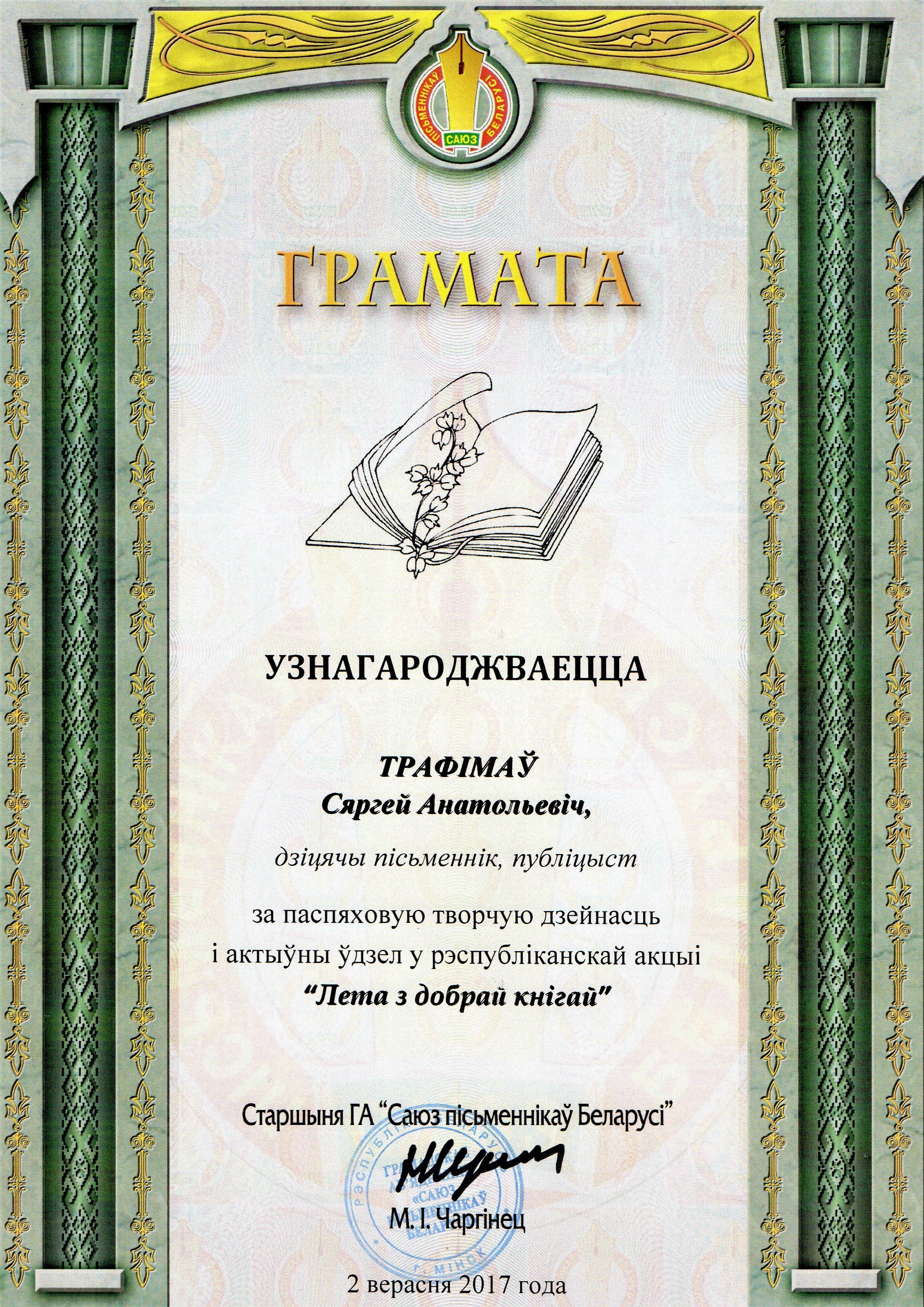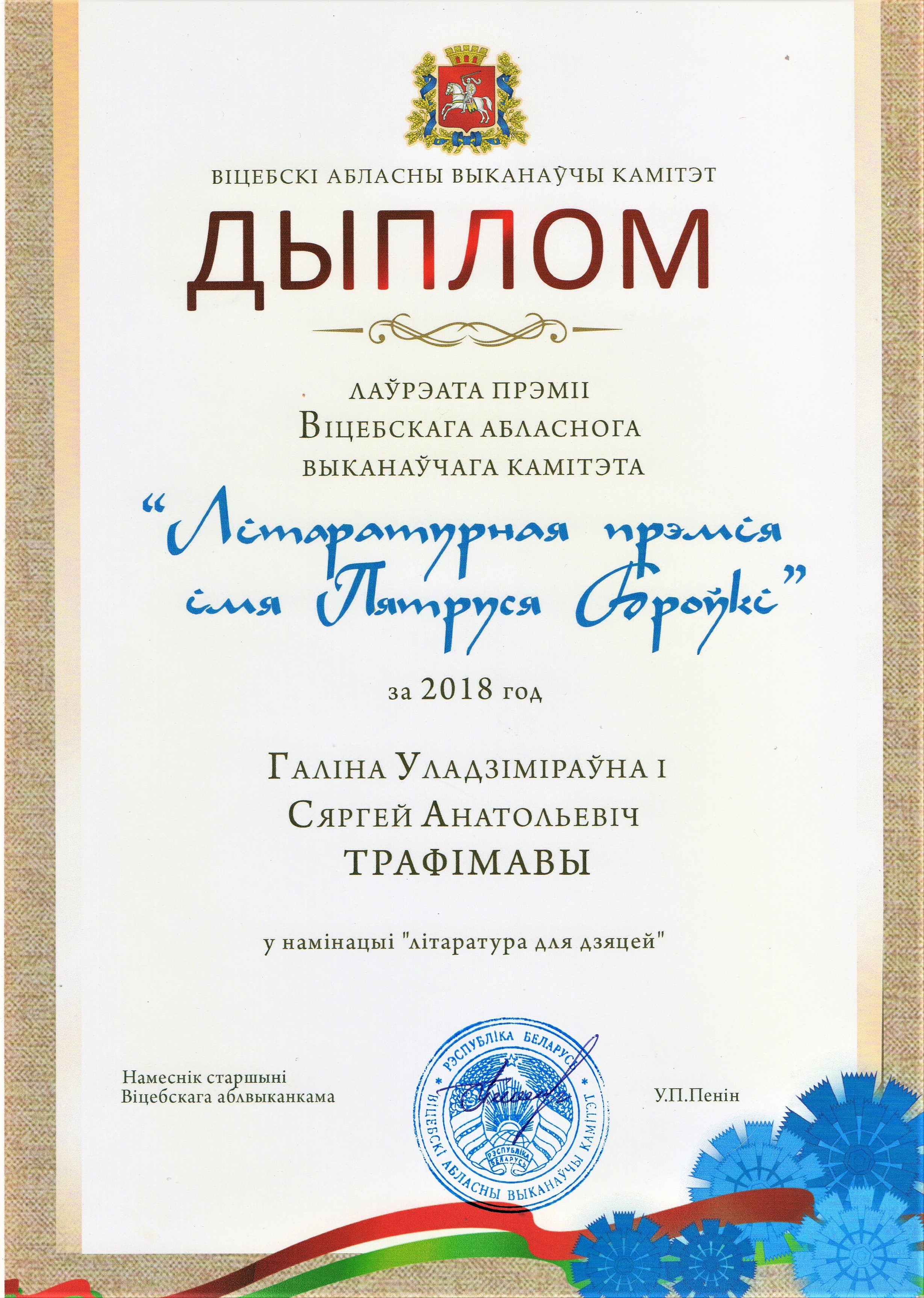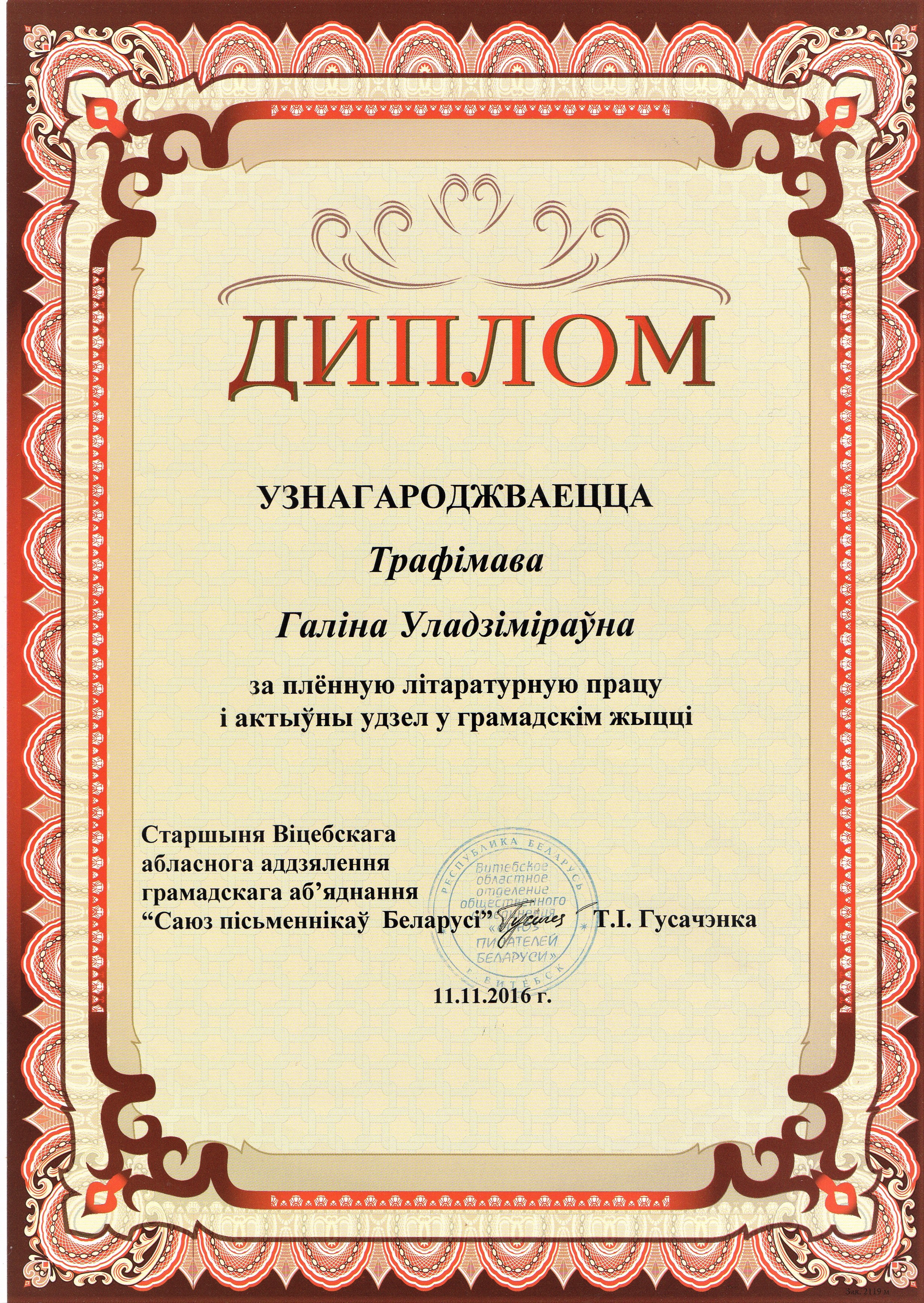 Раздзел уключае ганаровыя граматы, дыпломы, падзякі, якімі ўзнагароджанны Галіна і Сяргей Трафімавы